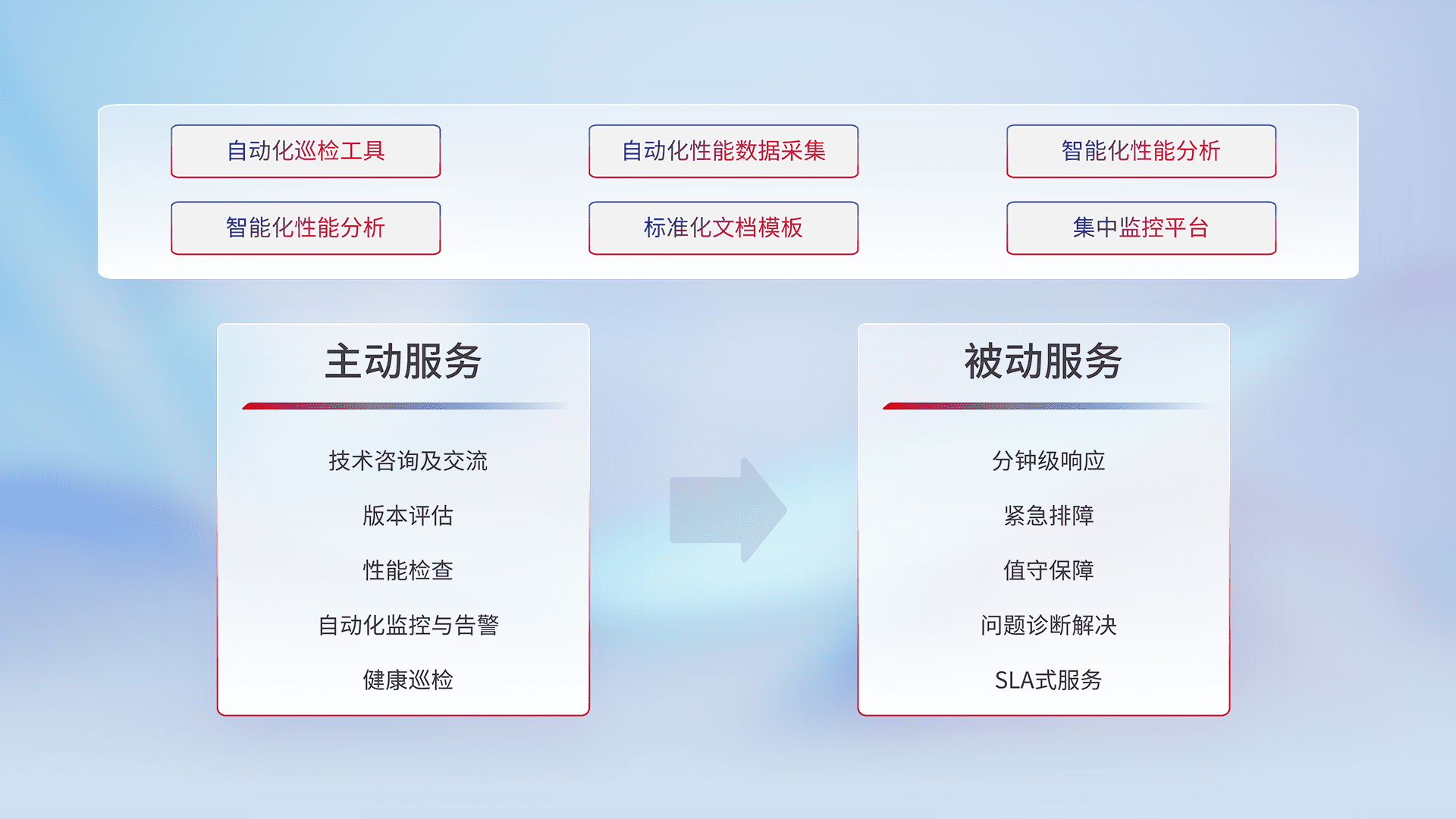 智能化工具和标准化文档,,,,保障服务质量,,提供主动服务(包含技术咨询、、、版本评估、、、性能检查、、自动化监控与告警、、、、健康巡检)和被动服务包含(分钟级响应、、、紧急排障、、、值守保障、、问题诊断解决、、、、SLA服务)。。。